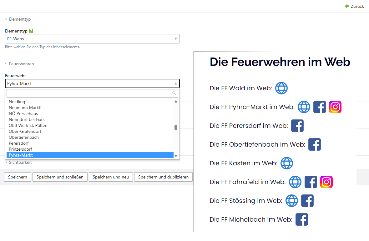 Mit dem Inhaltselement FF-Webs kannst Du in einem Newsbeitrag bequem die Internetpräsenzen aller beteiligten Feuerwehren anführen – etwa bei einer Abschnittsübung oder einem größeren Einsatz. So gelangen Besucher (oder die Presse) direkt zu den ergänzenden Berichten der anderen Feuerwehren und erhalten ein umfassenderes Bild des Geschehens.